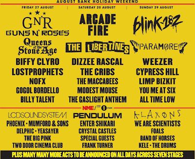 Por si les interesa este festival se lleva a cabo en el verano en la ciudad de reading en el condado de Berkshire en Inglaterra a pesar de los añejos head-liners hay opciones interesantes como: los we are scientists, klaxons & LCD Sound System, o hasta Gogol Bordello